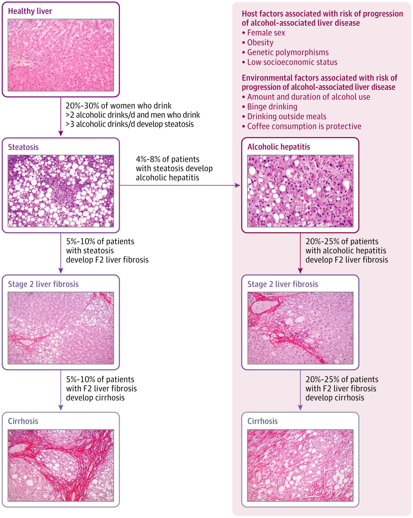 Figure 1. Histopathologic Features and Progression of Alcohol-Associated Liver Disease During 10 Years of Drinking More Than 2 Drinks per Day in Women and More Than 3 per Day in Men